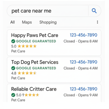 Appear at the top of search results with Local Service Ads—ideal for groomers, boarding facilities, and pet sitters with strong customer reviews. Use our LSA tool to check availability in your area.