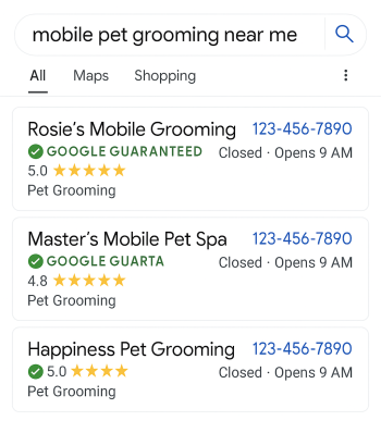 Appear at the top of search results with Local Service Ads—ideal for mobile pet grooming companies with strong customer reviews. Use our LSA tool to check availability in your area.