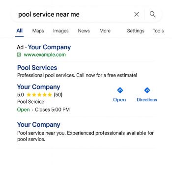 Appear at the top of search results with Local Service Ads—ideal for pool cleaning service contractors with strong customer reviews. Use our LSA tool to check availability in your area.